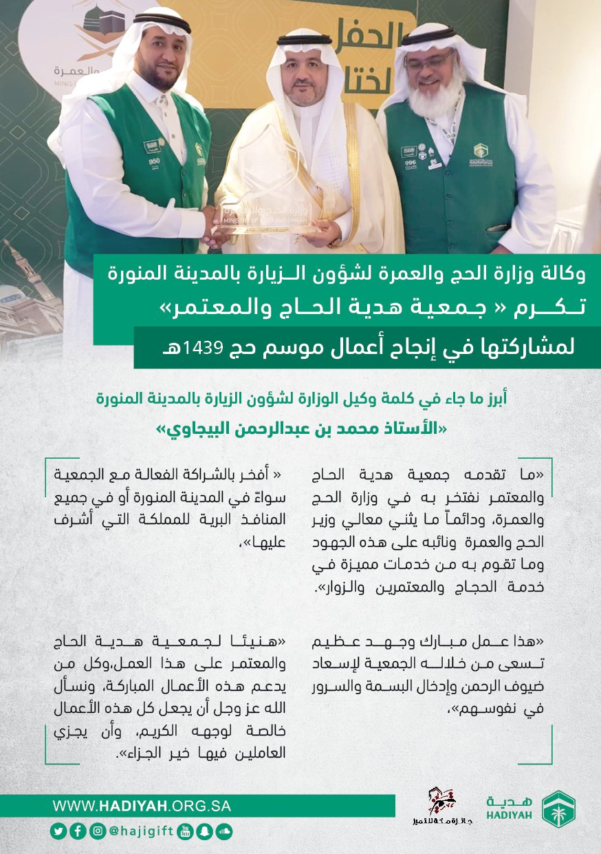 هدية الحاج والمعتمر On Twitter وكالة وزارة الحج والعمرة لشؤون الزيارة بالمدينة المنورة تكرم جمعية هدية الحاج والمعتمر لمشاركتها في إنجاح أعمال موسم حج39 Https T Co Iozyf1ycmm